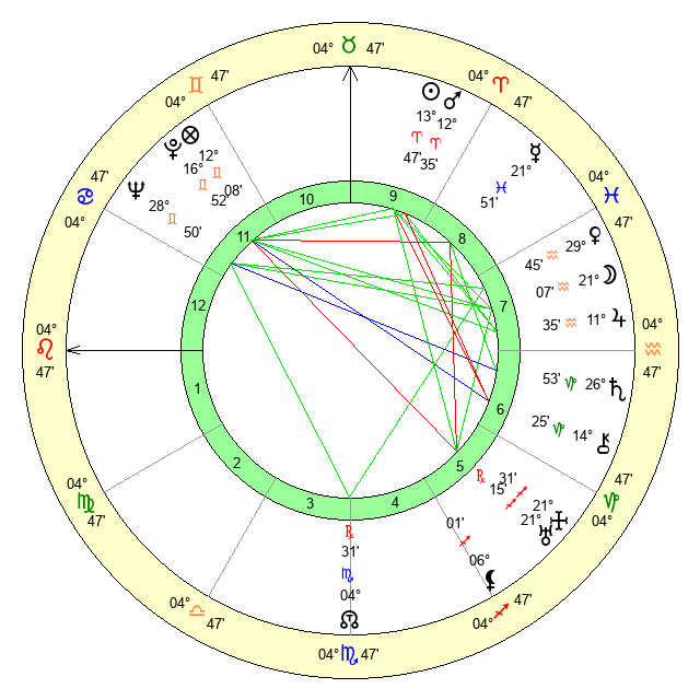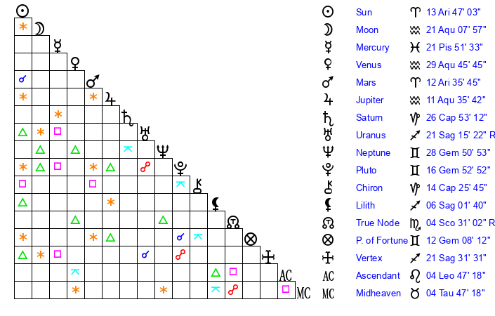 | Sun | 13 Aries 47 | 14 Aries 58 | 12 Leo 6 |