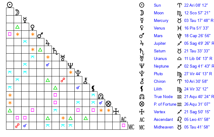 | Sun | 22 Aries 8 | 23 Aries 2 | 14 Gemini 22 |