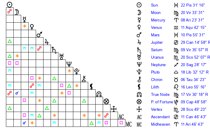 | Saturn | 10 Virgo 1 | 22 Pisces 11 | 7 Virgo 35 |