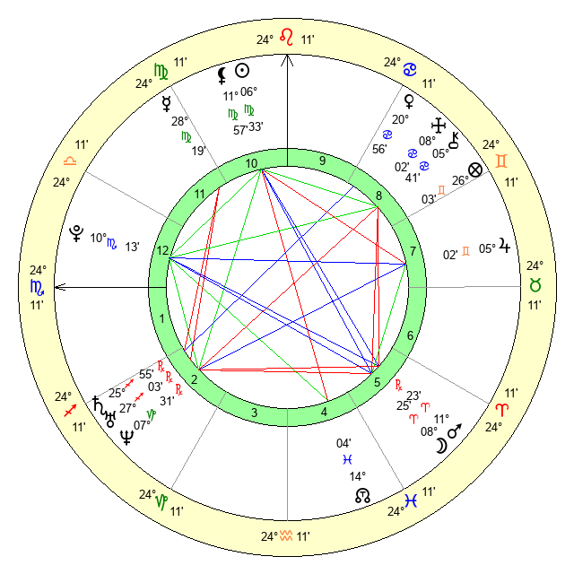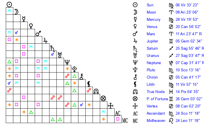 | Sun | 6 Virgo 33 | 6 Virgo 36 | 12 Libra 40 |