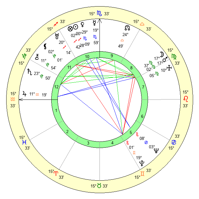 | Moon | 17 Virgo 34 | 9 Capricorn 9 | 7 Pisces 1 |