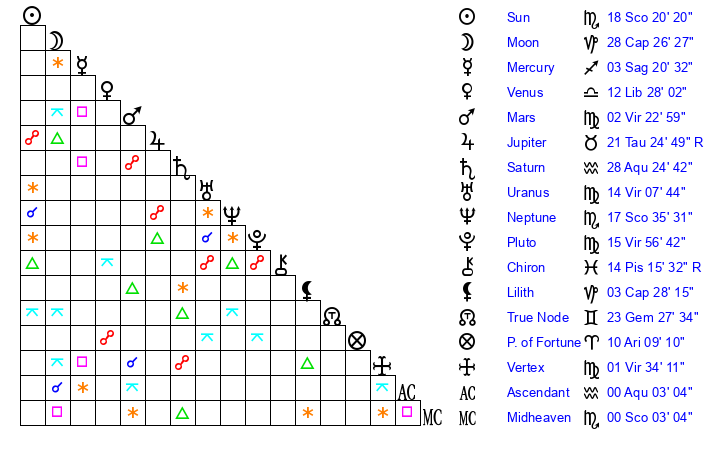 | Neptune | 17 Scorpio 35 | 27 Pisces 19 | 19 Scorpio 32 |