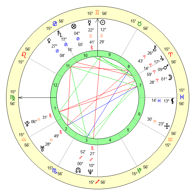 | Moon | 1 Aries 21 | 19 Virgo 43 | 5 Aquarius 35 |