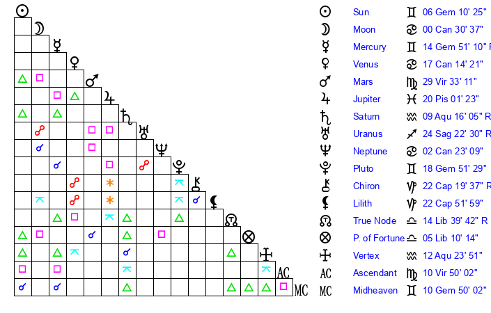 | Moon | 0 Cancer 32 | 29 Gemini 42 | 24 Sagittarius 14 |