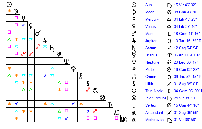 | Sun | 15 Virgo 46 | 16 Virgo 18 | 22 Sagittarius 29 |
