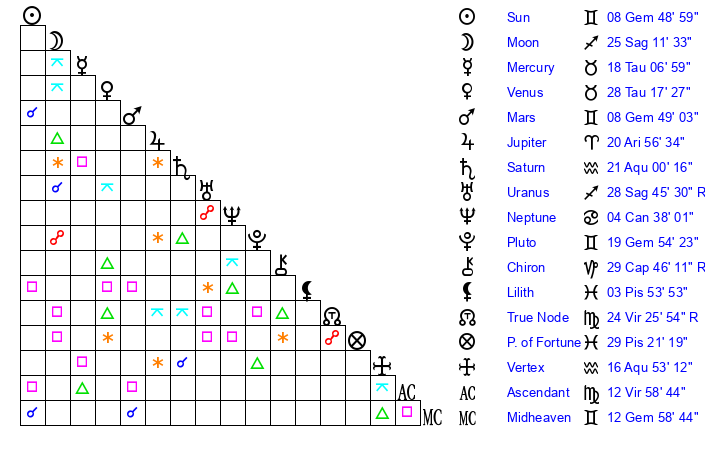 | Pluto | 19 Gemini 55 | 3 Aquarius 39 | 21 Gemini 43 |