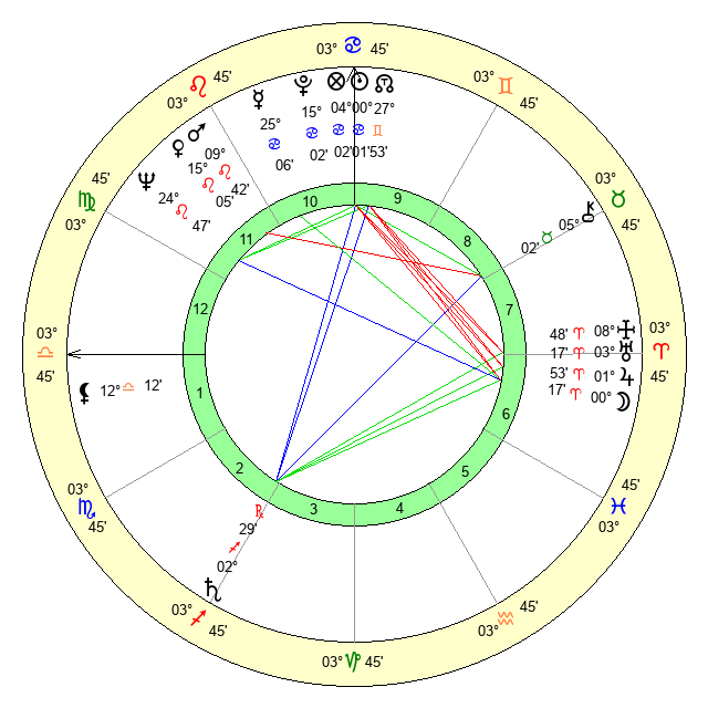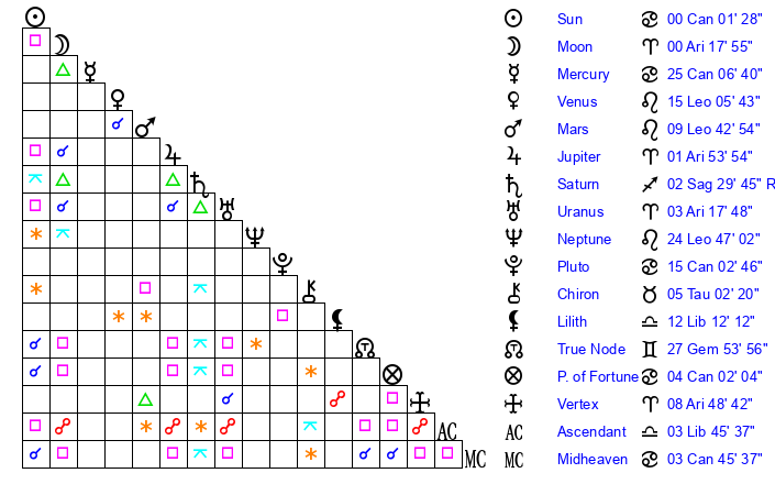 | Neptune | 24 Leo 47 | 2 Aries 7 | 28 Leo 5 |