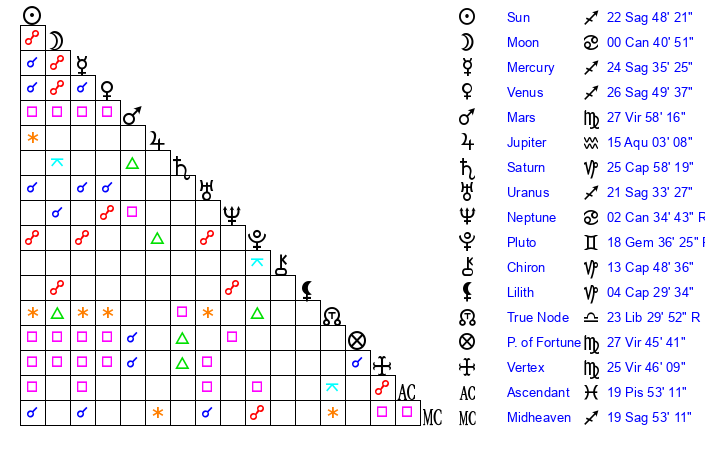 | Sun | 22 Sagittarius 48 | 23 Sagittarius 58 | 26 Aries 30 |