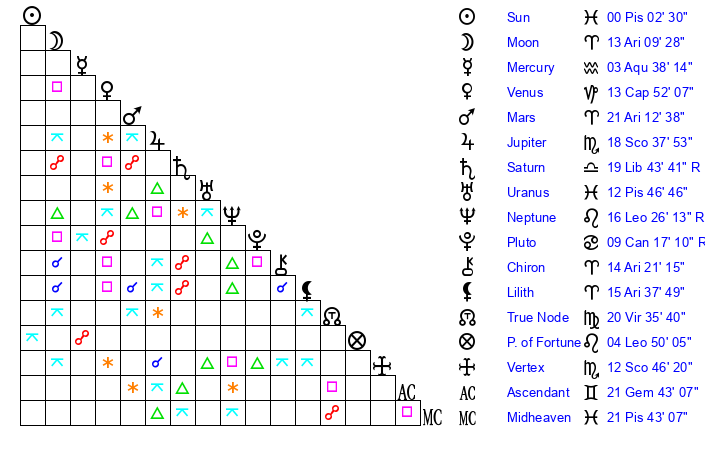 | Sun | 0 Pisces 2 | 1 Pisces 18 | 10 Gemini 10 |