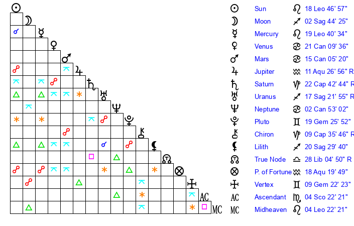 | Sun | 18 Leo 46 | 20 Leo 0 | 20 Sagittarius 31 |
