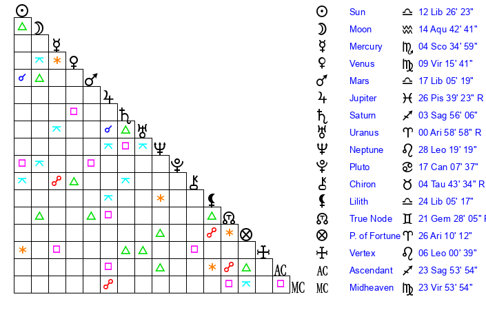 | Sun | 12 Libra 26 | 13 Libra 41 | 21 Capricorn 16 |