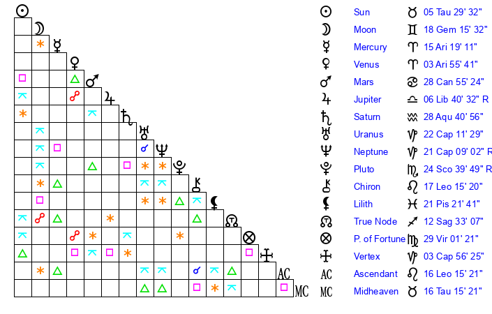 | Moon | 18 Gemini 21 | 6 Aries 0 | 22 Leo 34 |