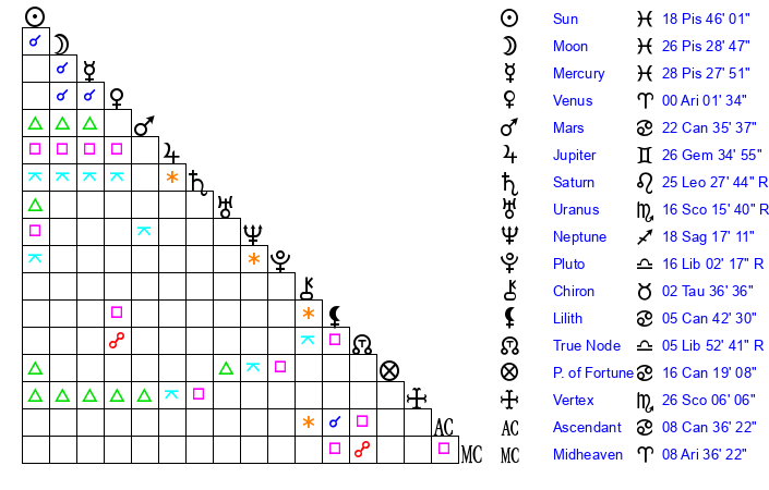 | Sun | 18 Pisces 46 | 19 Pisces 22 | 5 Taurus 8 |