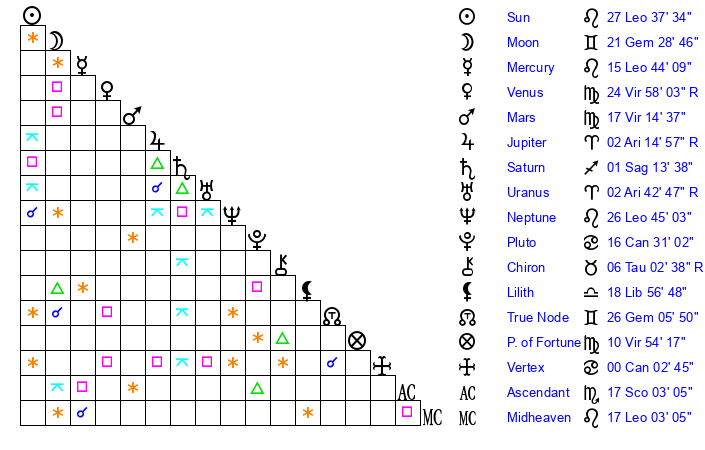 | Sun | 27 Leo 38 | 28 Leo 53 | 4 Sagittarius 28 |