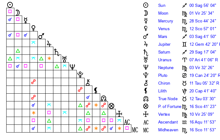 | Sun | 0 Sagittarius 56 | 1 Sagittarius 39 | 8 Pisces 23 |