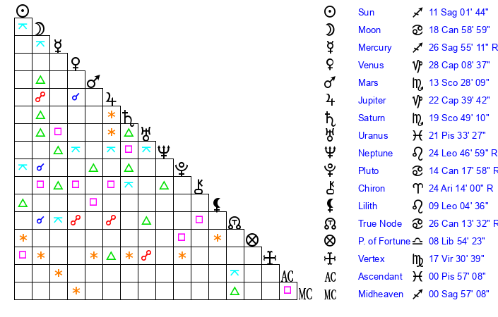 | Sun | 11 Sagittarius 2 | 11 Sagittarius 47 | 22 Pisces 22 |
