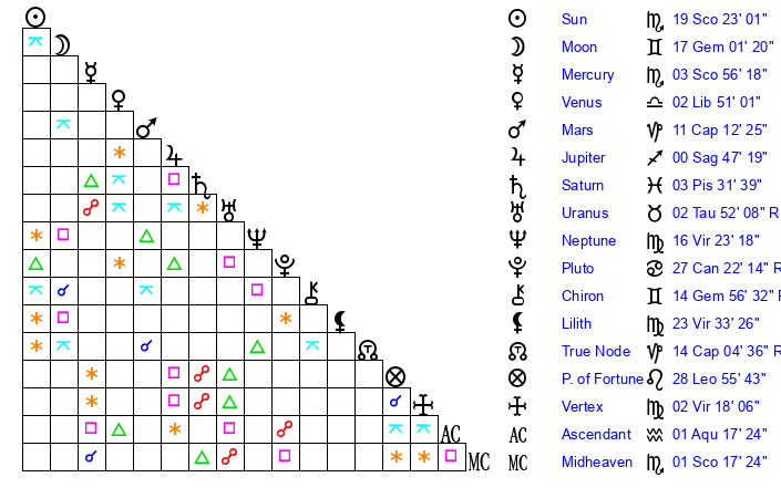 | Neptune | 16 Virgo 23 | 29 Pisces 34 | 16 Virgo 2 |
