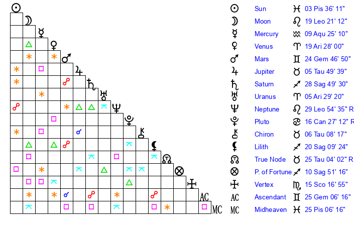 | Sun | 3 Pisces 36 | 4 Pisces 19 | 7 Gemini 49 |