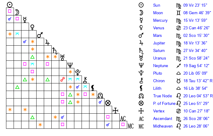 | Moon | 8 Gemini 43 | 25 Sagittarius 29 | 18 Capricorn 7 |