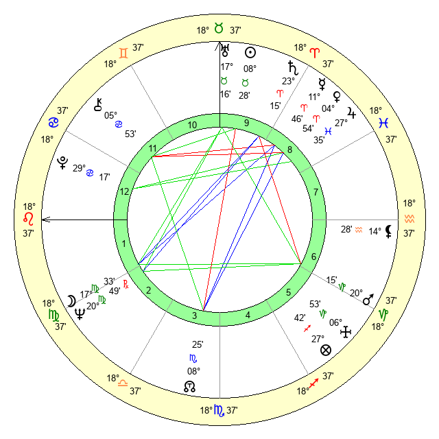 | Moon | 17 Virgo 39 | 6 Gemini 33 | 16 Scorpio 1 |