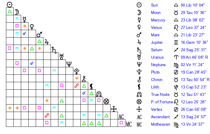 | Moon | 29 Taurus 4 | 21 Libra 57 | 11 Sagittarius 25 |