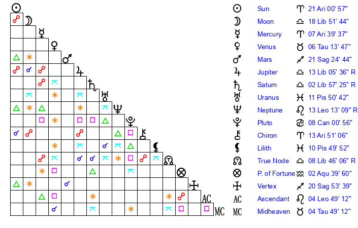 | Sun | 21 Aries 1 | 22 Aries 3 | 0 Leo 2 |