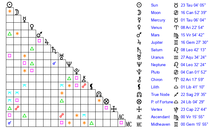 | Sun | 23 Taurus 4 | 24 Taurus 9 | 5 Virgo 31 |