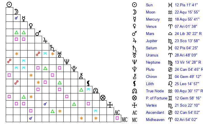 | Sun | 12 Pisces 11 | 13 Pisces 22 | 10 Gemini 15 |