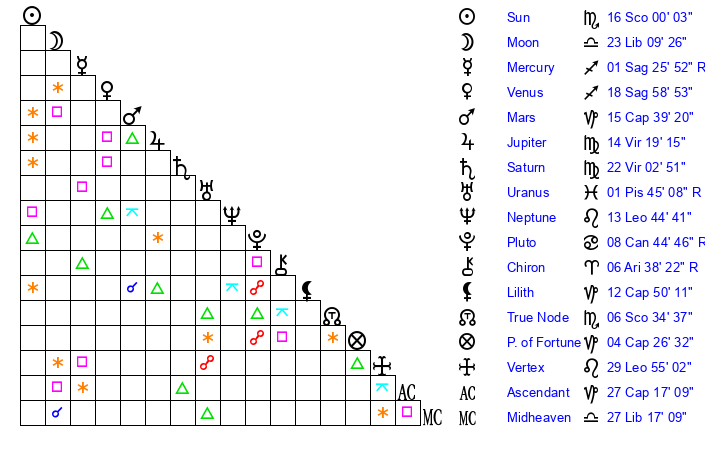 | Venus | 18 Sagittarius 59 | 2 Scorpio 13 | 18 Aries 45 |