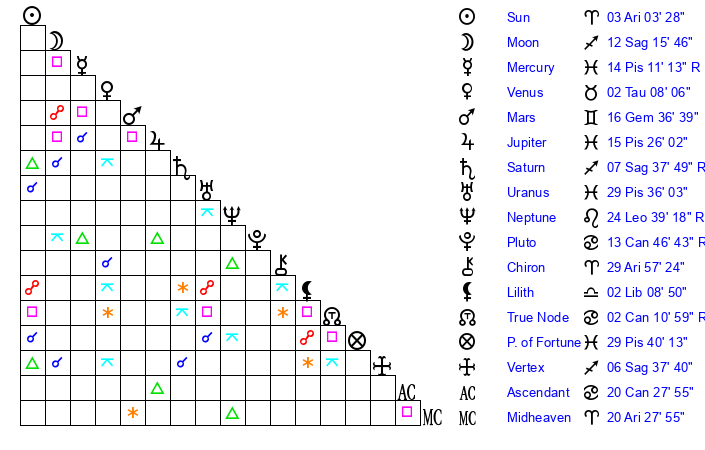 | Pluto | 13 Cancer 47 | 3 Aquarius 25 | 15 Cancer 16 |