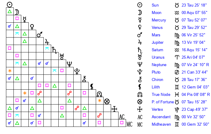 | Moon | 0 Aquarius 7 | 16 Sagittarius 18 | 8 Gemini 31 |