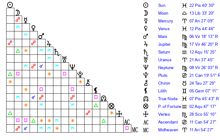 | Moon | 13 Libra 33 | 16 Virgo 46 | 6 Pisces 51 |