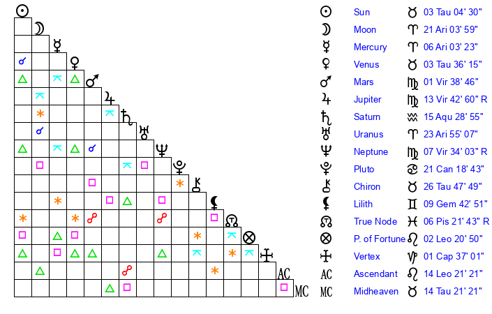 | Venus | 3 Taurus 36 | 26 Pisces 44 | 26 Leo 22 |