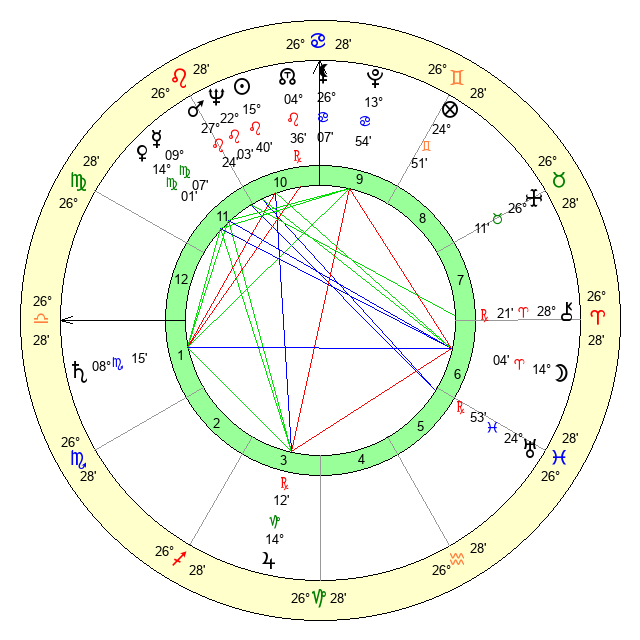 | Moon | 14 Aries 9 | 9 Aquarius 48 | 0 Sagittarius 21 |