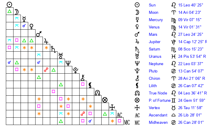 | Moon | 14 Aries 9 | 9 Aquarius 48 | 0 Sagittarius 21 |