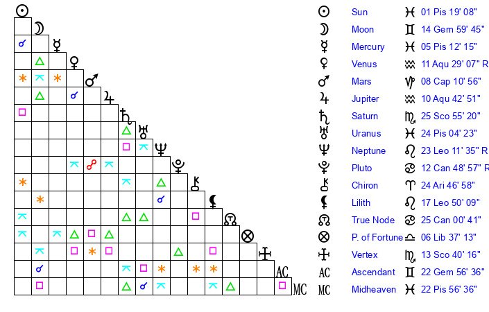 | Sun | 1 Pisces 19 | 2 Pisces 18 | 8 Gemini 30 |