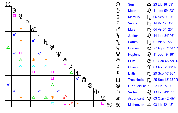 | Moon | 11 Leo 55 | 11 Virgo 53 | 21 Gemini 12 |