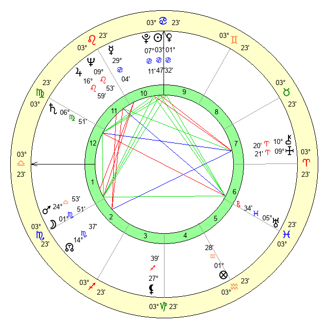 | Sun | 3 Cancer 47 | 4 Cancer 23 | 15 Libra 6 |