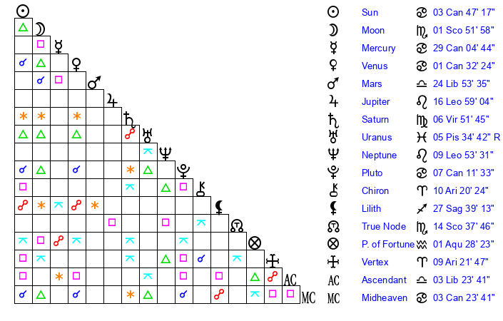 | Moon | 1 Scorpio 57 | 8 Cancer 1 | 3 Virgo 9 |
