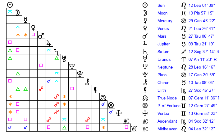 | Sun | 12 Leo 2 | 12 Leo 34 | 17 Scorpio 4 |