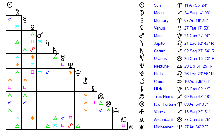 | Moon | 24 Sagittarius 7 | 27 Taurus 52 | 0 Cancer 11 |