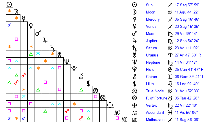 | Moon | 11 Aquarius 32 | 5 Virgo 12 | 16 Gemini 38 |
