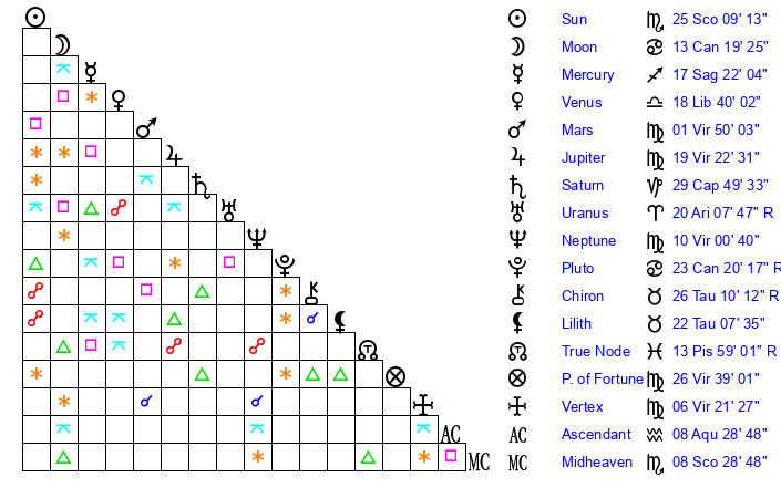 | Mars | 1 Virgo 50 | 9 Sagittarius 31 | 15 Virgo 1 |