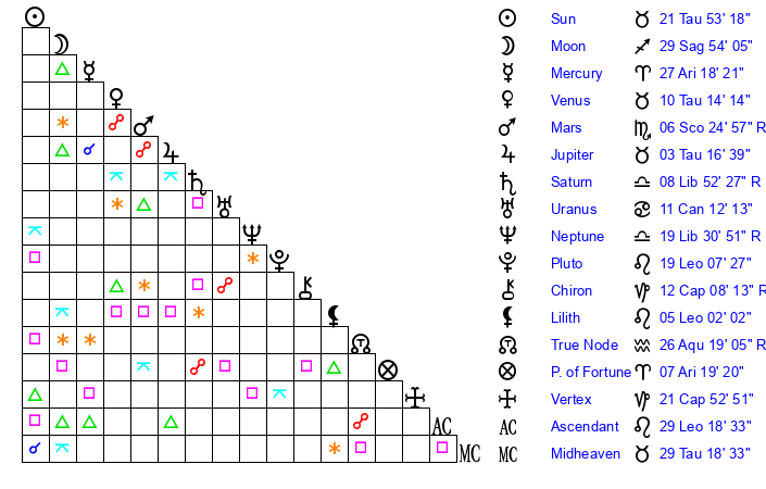 | Sun | 21 Taurus 53 | 22 Taurus 13 | 1 Leo 42 |