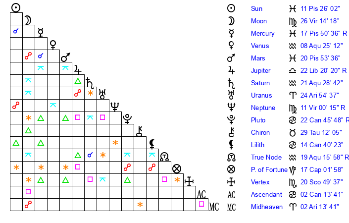 | Sun | 11 Pisces 26 | 12 Pisces 22 | 10 Gemini 29 |