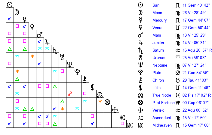 | Moon | 26 Virgo 25 | 7 Virgo 26 | 20 Aquarius 7 |