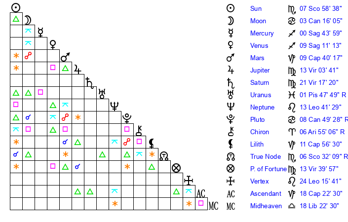 | Sun | 7 Scorpio 58 | 8 Scorpio 31 | 24 Aquarius 28 |