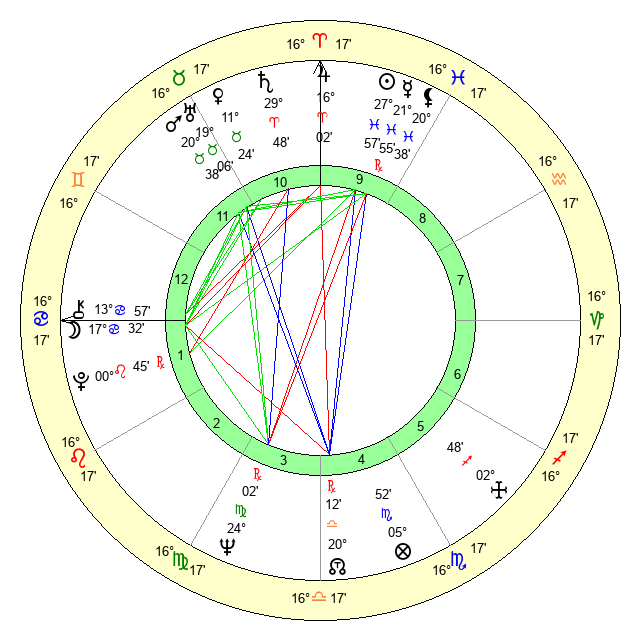 | Moon | 17 Cancer 35 | 16 Scorpio 22 | 2 Virgo 34 |