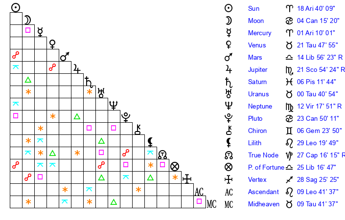 | Sun | 18 Aries 40 | 19 Aries 51 | 15 Cancer 21 |
