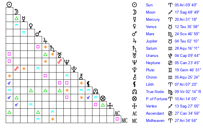 | Sun | 5 Aries 10 | 6 Aries 5 | 0 Leo 53 |